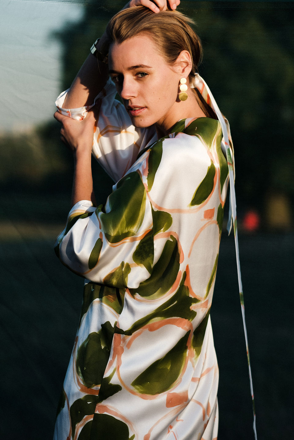 In Berlin, HvG partnered with the great artist Philipp Rößle to design the Kimono Collection. He spent one summer painting on 30 meters silk of which I made only12 one-of-a-kind silk Kimonos. Each rare, silk Kimono is signed by the artist.